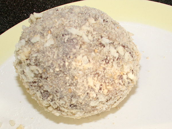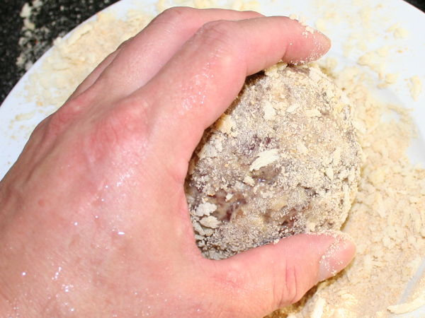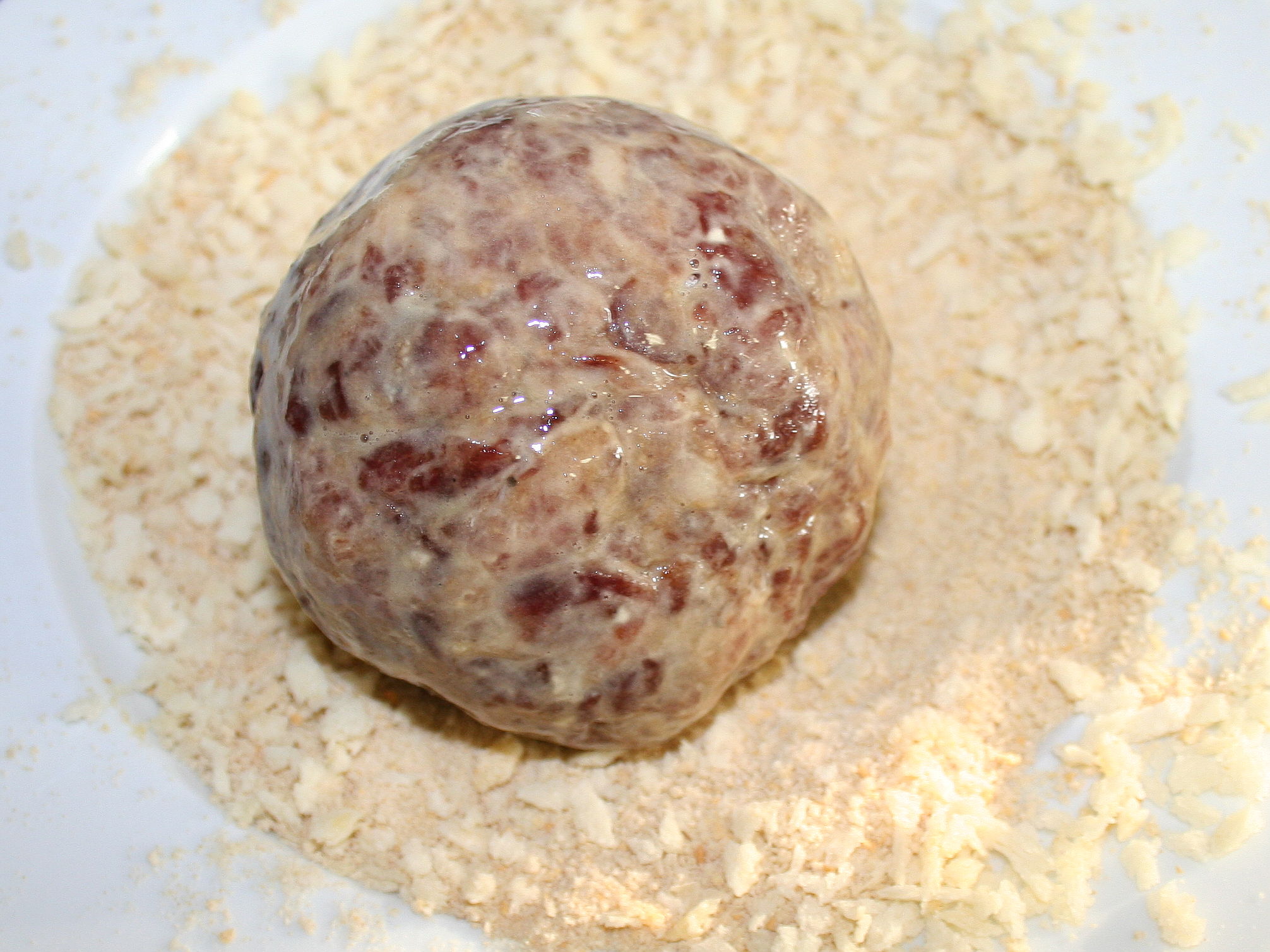 - Haal de bal achtereenvolgens door de bloem (zorg dat het een dun laagje wordt), het geklutste ei en de paneermeel.