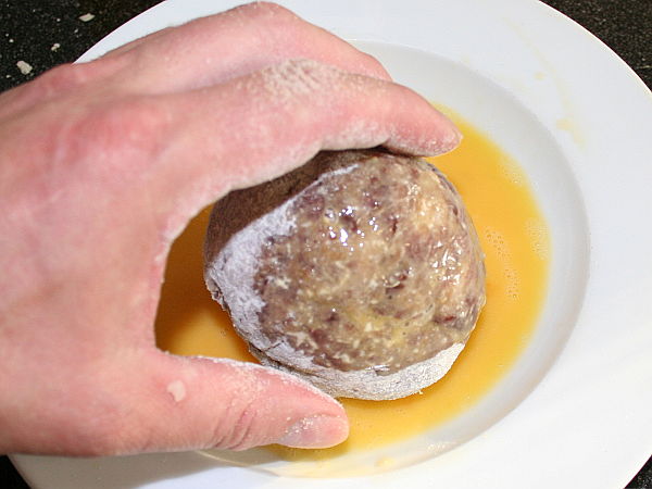 - Rol het ei even door de bloem en zet het ei in het midden van de schijf en vouw voorzichtig met behulp van de folie het worstvlees er om toe. Gebruik eventueel de andere hand (met koud water nat gemaakt) om het laatste gaatje dicht te strijken/kneden.