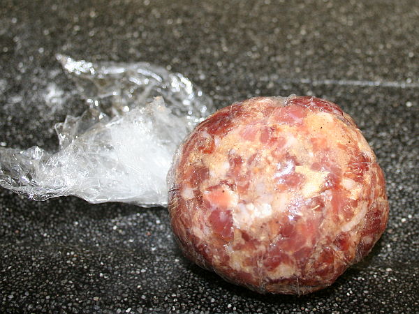 - Neem de helft van het worstvleesmengsel en leg dat op een stuk vershoudfolie.